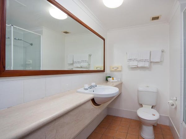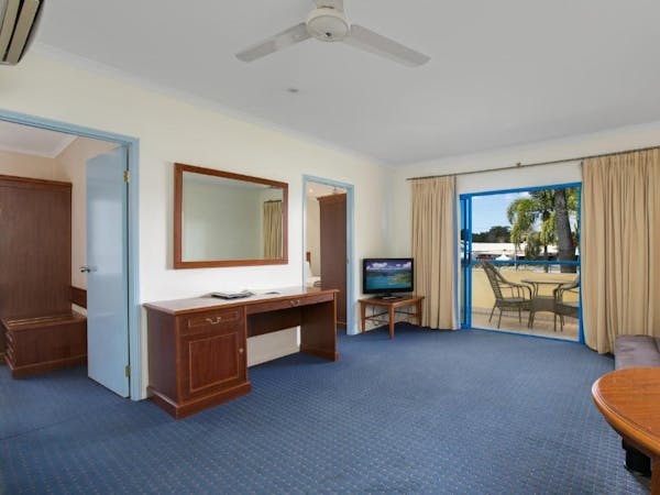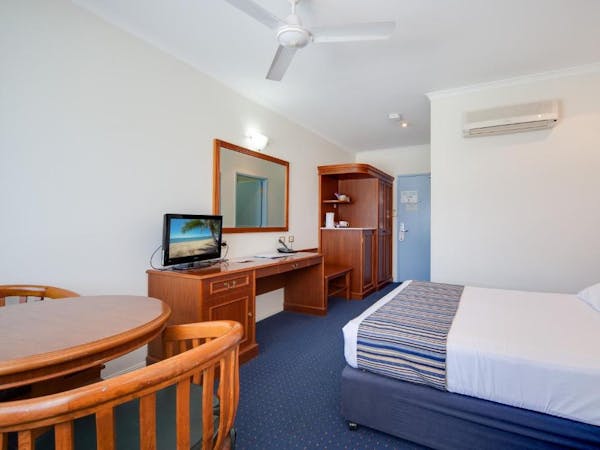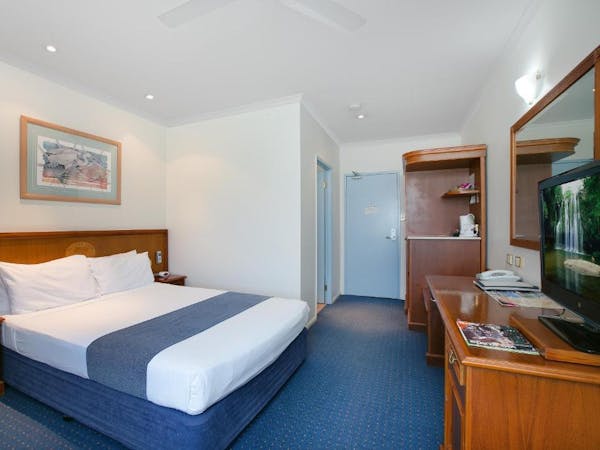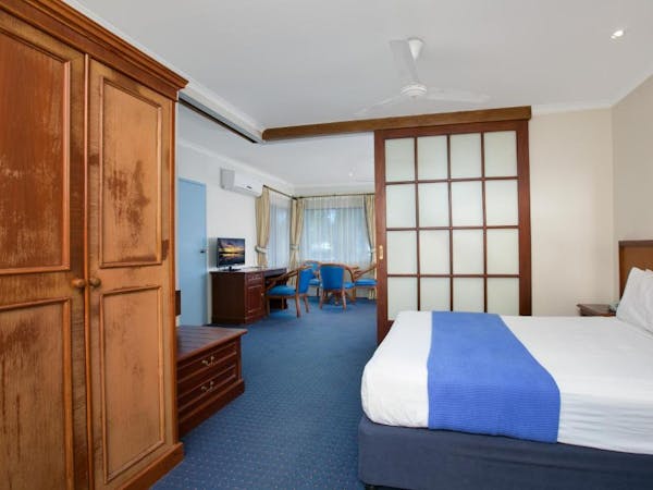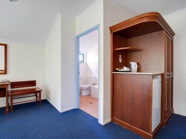 Our Accessible Queen Room is tailored for accessibility, equipped with a comfortable queen bed within an air-conditioned setting. The private bathroom is fitted with disability access accessories to ensure convenience for all guests. Room amenities include a 32-inch flat-screen TV, a microwave, a refrigerator, and a mini bar, catering to both entertainment and dining needs. Practicalities are covered with the inclusion of an iron, hairdryer, safe, and tea/coffee making facilities. A desk with chairs also provides a versatile space for work or leisure.