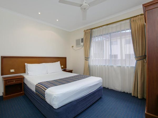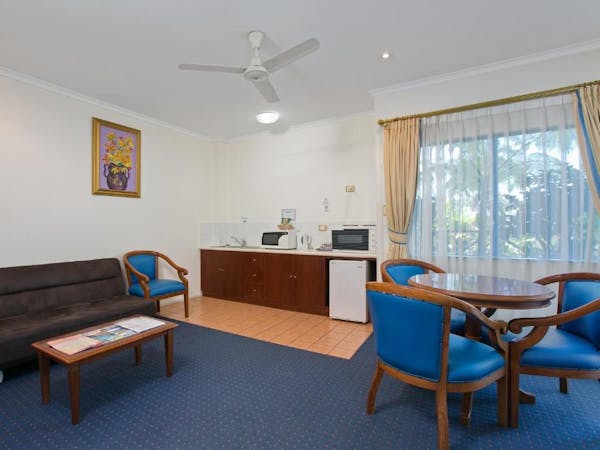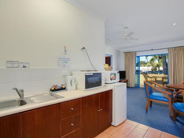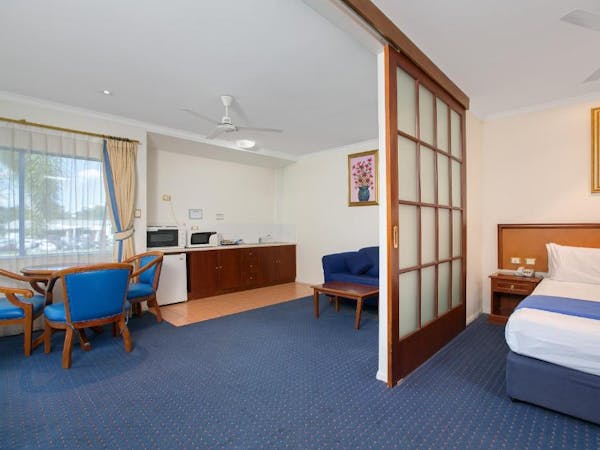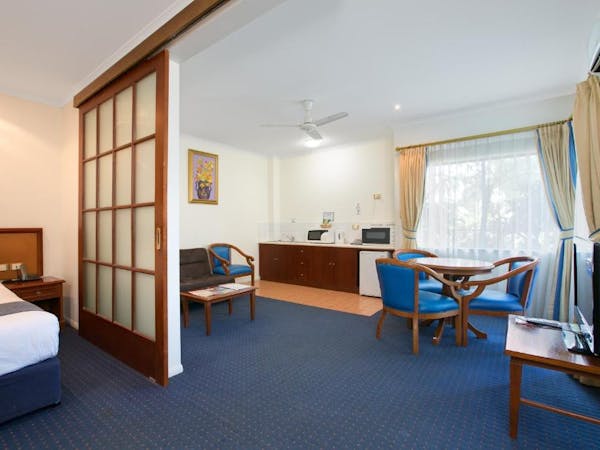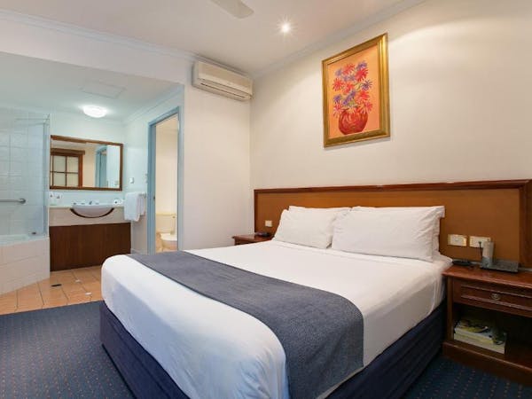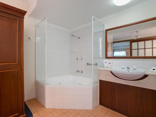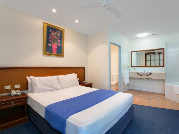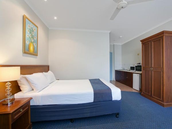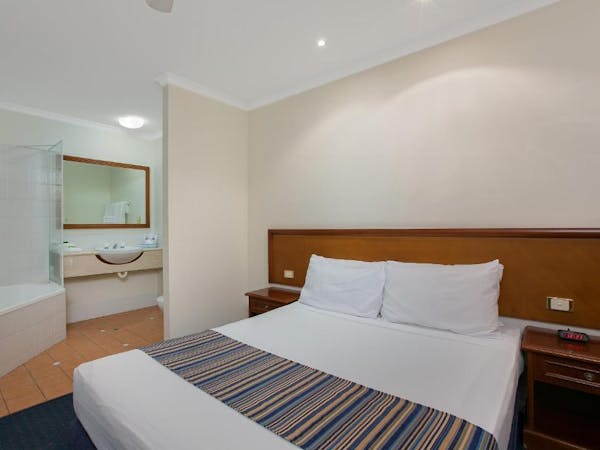 Our Budget Queen Spa Studio offers an indulgent retreat with its air-conditioned suite that includes a queen bed and an ensuite spa bath. The suite extends to a private balcony and is equipped with a self-contained kitchenette for convenience. In the separate lounge area, guests can unwind with a flat-screen TV. Please note, the spa bath's location within the master bedroom means the bathroom area is not entirely private.
