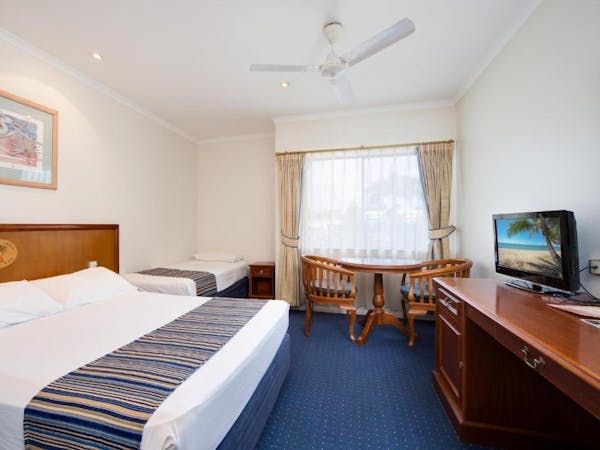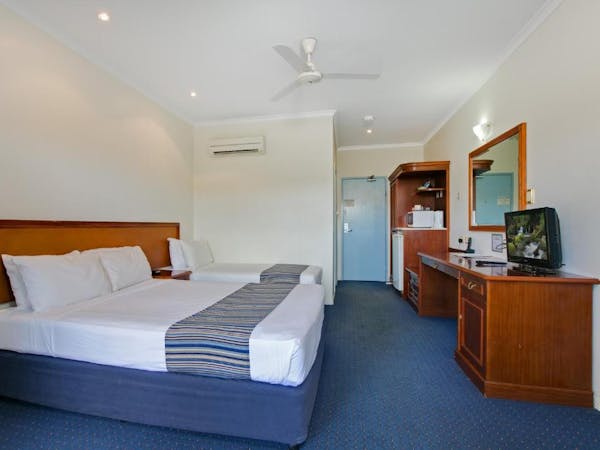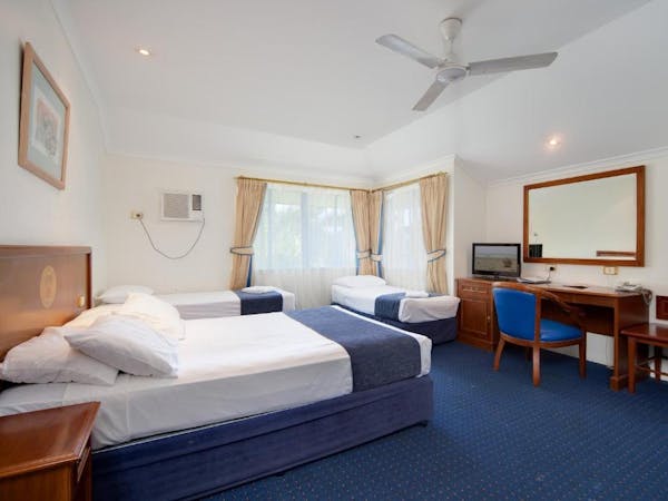 Our Budget Medium Family Room caters to family needs with one queen bed, a bunk bed, and an additional single bed, all within an air-conditioned environment. It's equipped with a private bathroom, ensuring privacy and convenience. For in-room entertainment, there's a flat-screen TV, and the inclusion of a microwave, refrigerator, and mini bar provides all the essentials for a comfortable stay. The room also comes with practical amenities such as an iron, hairdryer, and safe, while tea and coffee making facilities, alongside a desk with chairs, offer a touch of home and functionality.