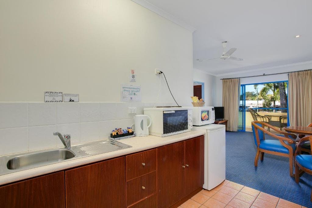 Our Budget Two-Bedroom Apartment features a queen bed in one room and two singles in the other, both air-conditioned and connected for privacy and convenience. The living space includes a cozy lounge area with a flat-screen TV and a self-contained kitchenette, leading to a balcony. Essential amenities like a refrigerator and a desk area blend functionality with comfort. The decor is warm and inviting, perfect for both relaxation and practical needs.
